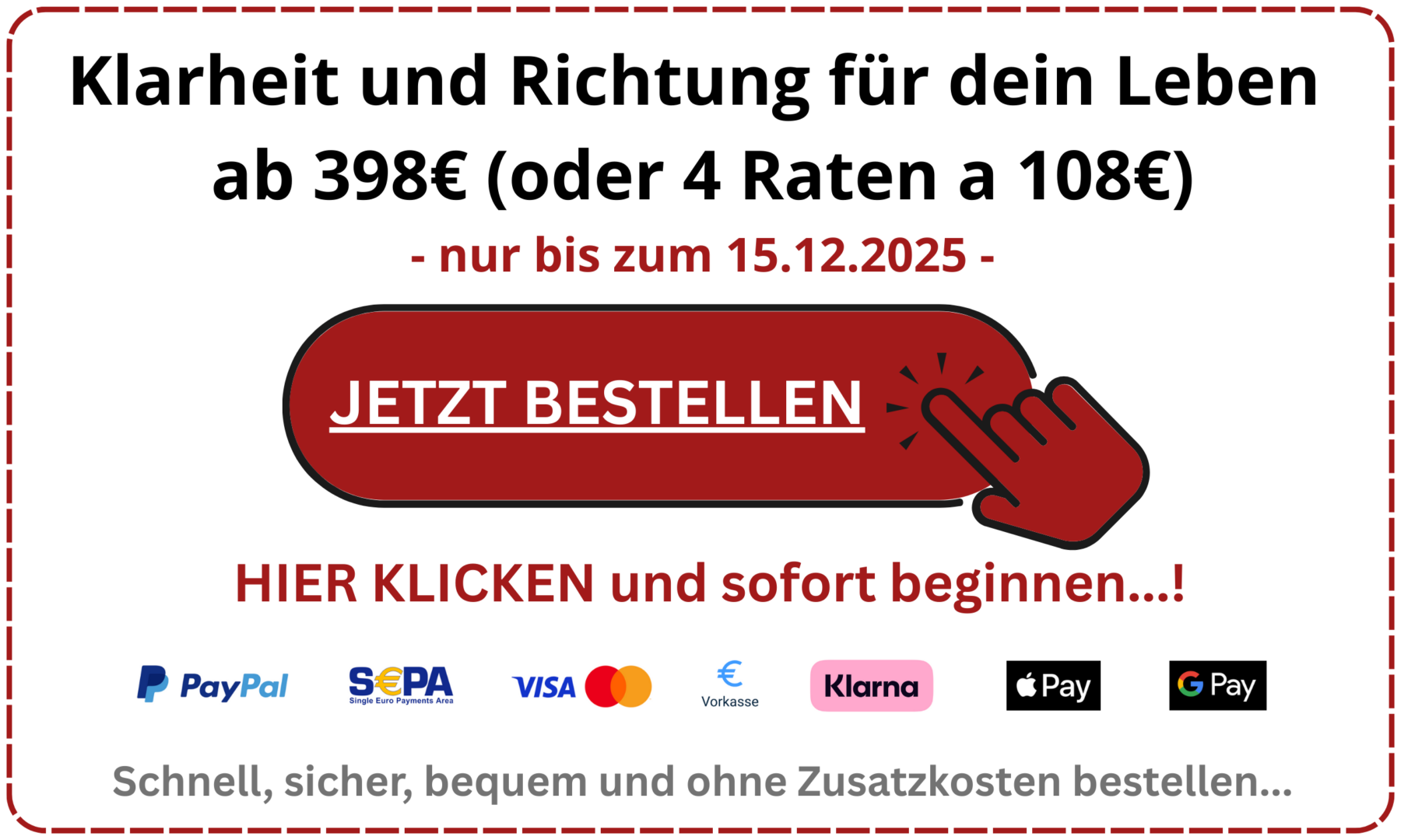Wenn du jetzt nicht beginnst, wird dein Alltag sich nicht verändern. Es bleibt beim Wunsch – aber nichts bewegt sich wirklich. Du verpasst die Chance, deinem Leben eine klare, neue Richtung zu geben.